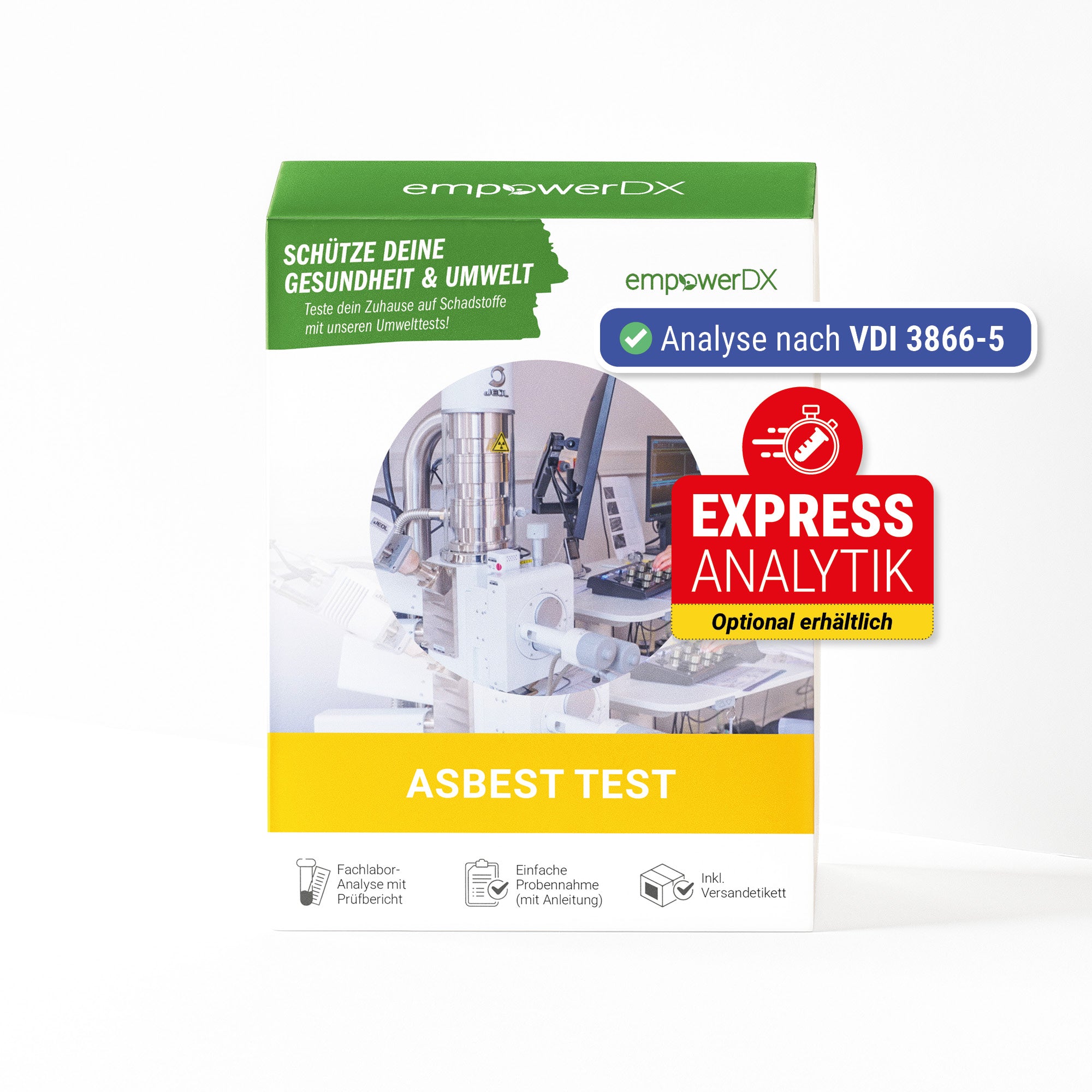 - Du hast dich für die Option Standardversand entschieden: Nach der Bestellung bekommst du von uns ein Probenahmeset geliefert. In diesem Set sind die benötigen Probenahmeutensilien, eine leicht verständliche Probenahmeanleitung und ein Rücksendeetikett an unser Partnerlabor enthalten.
